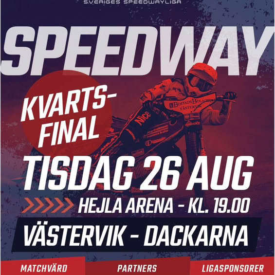 På tisdag smäller det – då avgörs kampen om en plats i semifinalen när Västervik Speedway tar emot länsrivalen Dackarna i den helt avgörande kvartsfinalen! Det första mötet slutade i seger med två poäng – men nu återstår den verkliga prövningen. Det är halvtid, och allt står på spel. Räkna…
