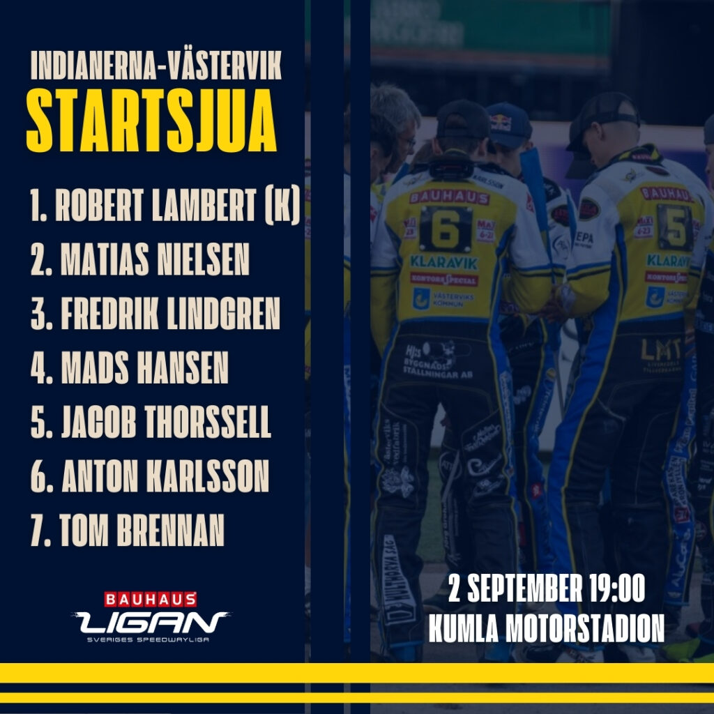 Nu är den här – startsjuan till tisdagens semifinal mot Indianerna på Kumla Motorstadion. Givetvis sänder Vikens Fodd & Friends matchen och som vanligt utlovas god mat och dryck samt en grym stämning. Kom dit och heja fram oss! Indianerna – Västervik Speedway 2 september 19:00 Kumla Motorstadion #tillsammans
